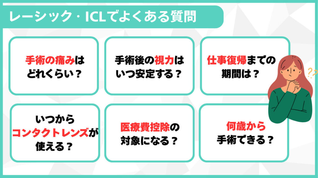 レーシックとICLの費用感や特徴をはじめ、手術を受けられないケースや保険の扱いまで順を追って解説しています。