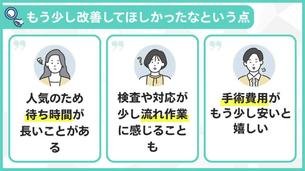 ただし「特に改善点はない」「満足している」という声も多く、全体としては満足度の高いクリニックであることがうかがえます。