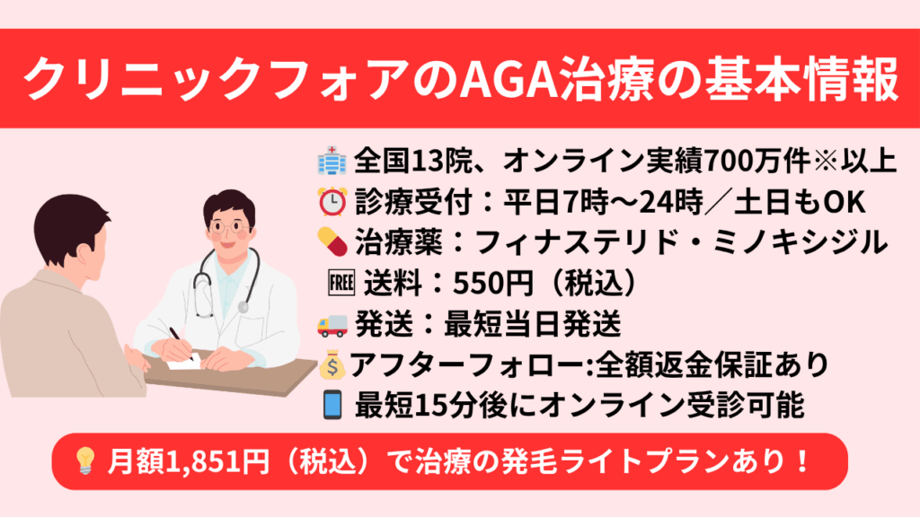 クリニックフォアはAGA治療の取り扱いがあり、オンライン診療が可能なクリニックです。